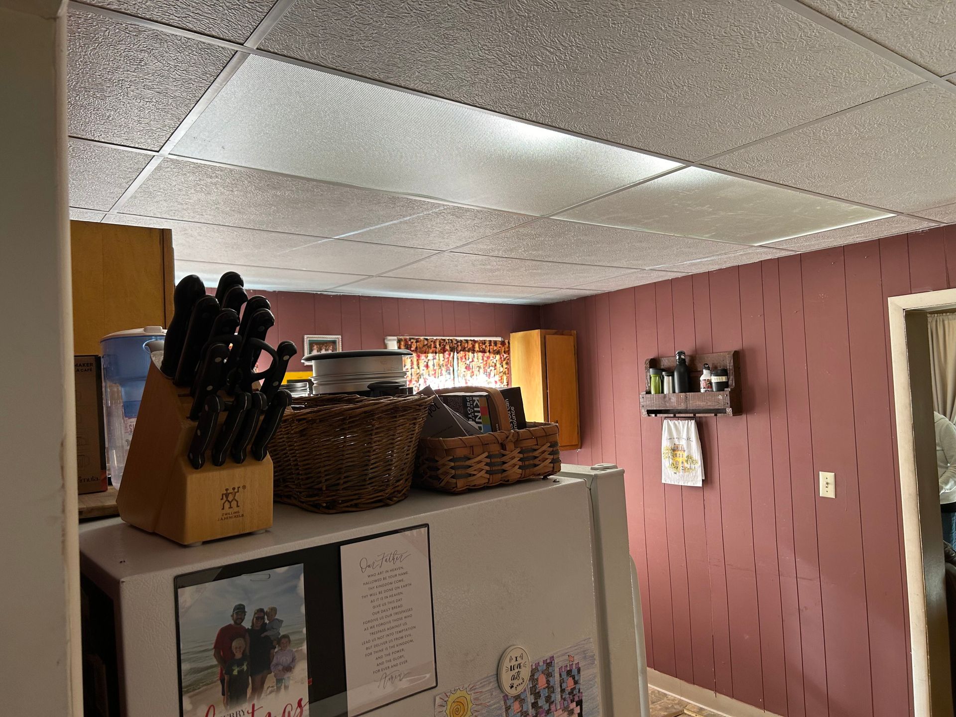 A ceiling with a lot of pipes hanging from it.